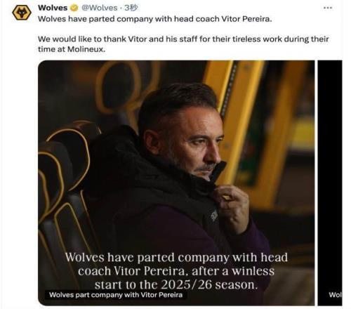 狼隊官宣主帥佩雷拉下課:“狼隊與主教練維托爾·佩雷拉分道揚鑣。我們要感謝維托和他的團隊在莫利紐球場工作期間的辛勤付出。”新賽季前10輪,狼隊2平8負一場不勝排名墊底,在本輪0比3輸給富勒姆后,俱樂部決定解除佩雷拉主帥職務。去年12月佩雷拉上任救火,各項賽事帶隊38場,14勝6平18負,勝率36.84%。佩雷拉是門德斯經紀公司旗下教練,今年9月,他剛與狼隊續約到2028年,不過據悉其合同中有特殊條款,使得狼隊無需賠償合同內的全額薪水。
